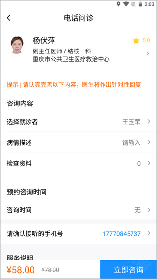 选定医生后,进入咨询界面。挑选就诊人、填写病情描述、上传检查资料,然后点击“立即咨询”。