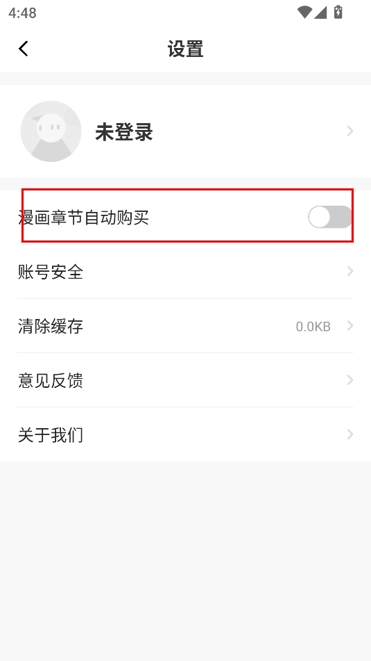 2. 于打开的设置界面里,开启“漫画章节自动购买”功能便可。