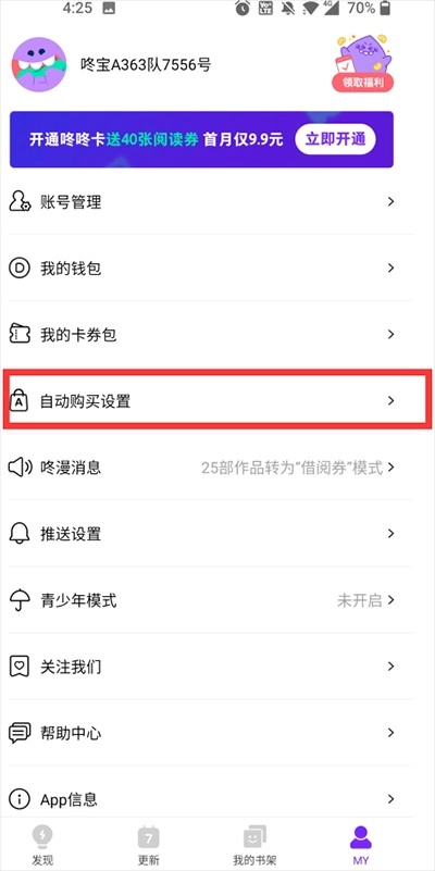 2. 接着找到“自动购买设置”,将对应的自动购买漫画取消就行。