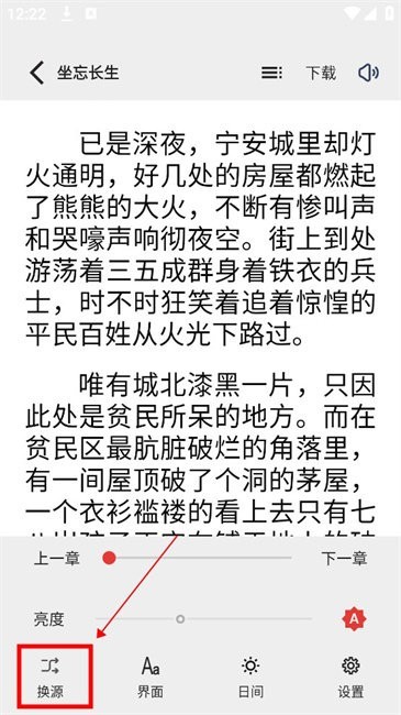 4. 在阅读页面进行单击操作,即可唤起功能菜单。若想更换书源,点击页面左下角的“换源”按钮即可。
