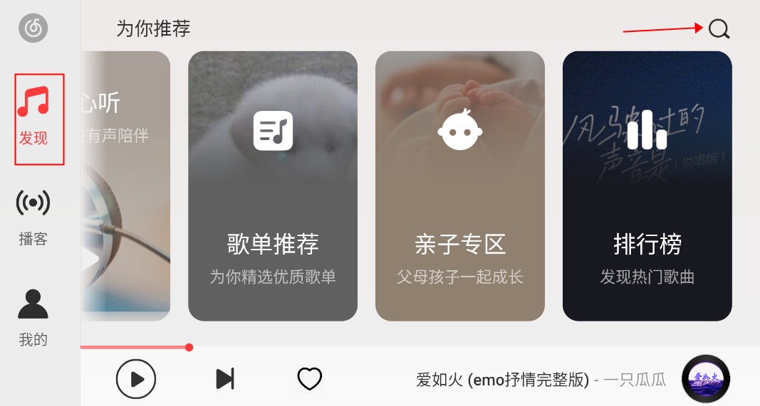 1. 安装本站所提供的网易云音乐车载版,进入软件后,既能够选择播放FM,也可以选择继续播放歌曲。