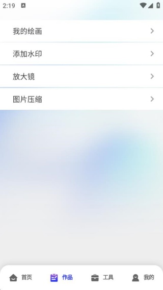 2、点击作品,这里面有我的绘画收藏。不仅如此,还能使用添加水印功能,同时具备放大镜以及图片压缩工具可供使用。