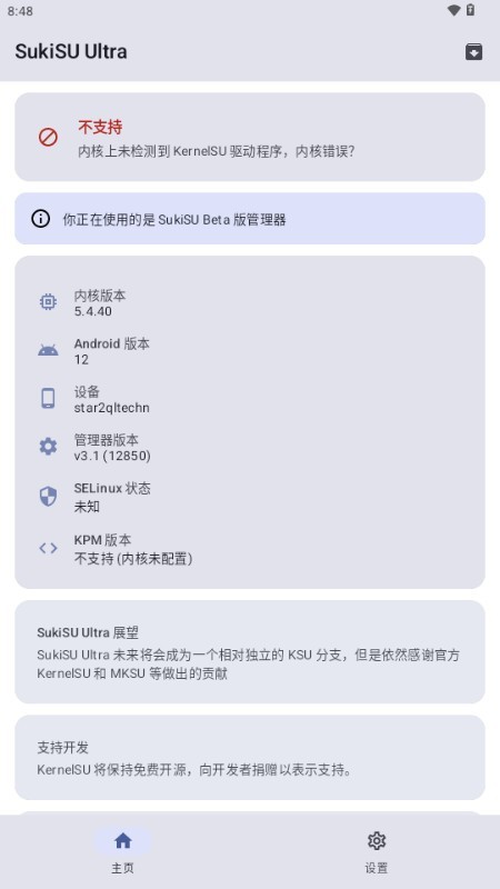 接着,在你的设备上安装SukiSU Ultra管理器并将其打开。要是它显示“不支持”,这表明你的设备没有开箱即用且支持的boot image ;不过,你能够自行编译内核并集成SukiSU Ultra,从而得以使用它。
