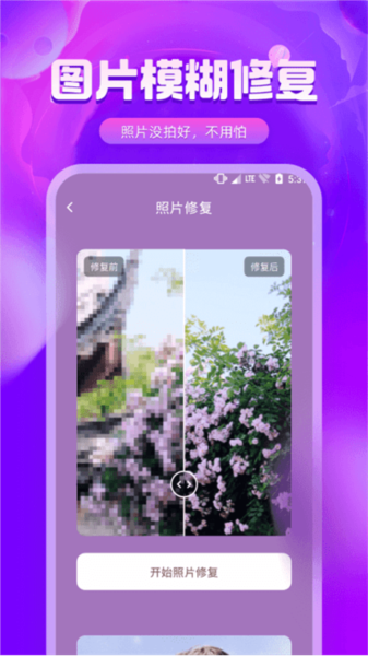 图片修复精灵是一款由湖南万维沃克信息科技有限公司研发功能丰富、工具多多的图片处理工具。大家可以在上面一键恢复视频以及图片文件,轻松的修复图片的画质清晰度,老旧的照片也能够进行智能的上色处理、更改像素参数,模糊变清晰,清晰变模糊。还可以帮助大家轻松的找回自己误删掉的手机照片,而且软件的操作方法也非常简单好用。使用全球领先的AI图像生成技术打造在线照片智能修复的软件,您只需要从手机相册中选择模糊的照片提交处理,就能轻松获得高清的好照片。支持修复老照片、低像素图片、网络和聊天工具传输压缩后的图片、动漫游戏截图等。感兴趣的可以体验一下!