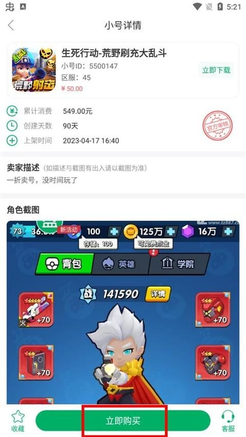 4、轻点小号,即可查看该小号角色的装备等详细信息。挑选到合适的小号后,点击“立即购买”,交易便完成了。