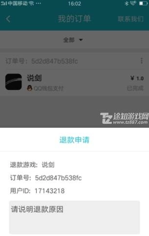 4、点击“申请退款”,填写退款原因后即可完成退款操作。