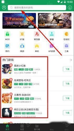 1、在热门游戏里能看到当下最热门的游戏,也可以在上方搜索框搜索你喜爱的游戏,如下图所示:
