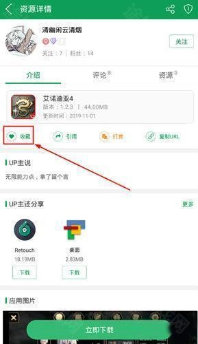 3、收藏UP游戏资源时,各类收藏图标的位置稍有差异,但整体操作过程基本一致。用户可在“我的收藏”里找到此前收藏的游戏资源,如下图所示: