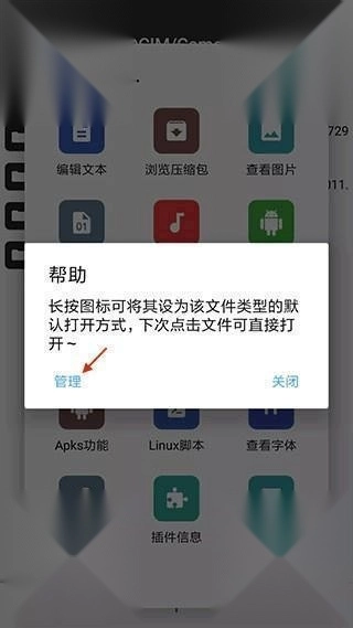 于打开方式对话框内,点击右上角的“?”,随后点击“管理”。
