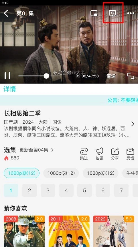 3、找到并点击你想看的影片,在影片播放页面的右上角,有一个TV图标,点击该图标,就能搜索设备进行投屏。