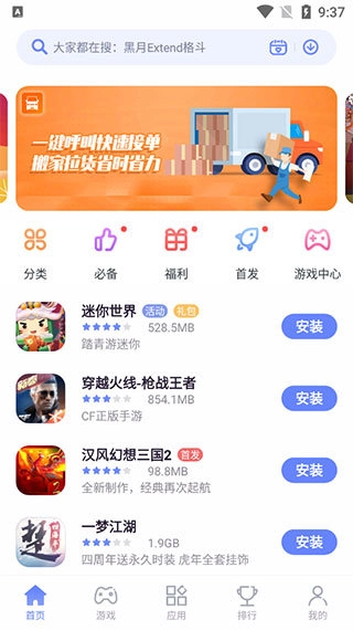 2、接下来便是首页,此处展示着一些热门的游戏或应用。