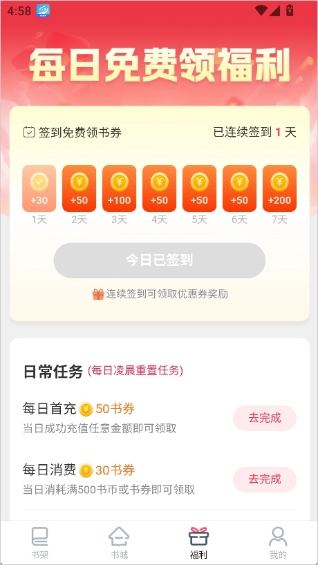 2、在福利页面,平台会提供各种任务,大家只需按要求完成,就能获得相应的书券奖励。