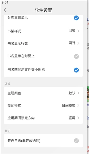 在软件设置中,能够对书架样式进行修改,还能切换夜间模式以及主题颜色等。