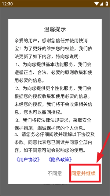 在本站完成安装后,打开快消宝,首先要同意并继续温馨提示。