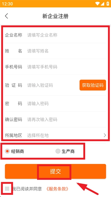 请按要求填写相关信息,从经销商与生产商中作出选择,同时勾选“我已阅读并同意《服务条款》”,最后点击提交。