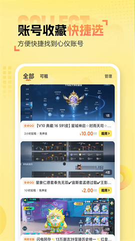 5、简约清爽的界面设计,操作流程一目了然,让每位玩家轻松上手,迅速找到并租赁到所需账号。