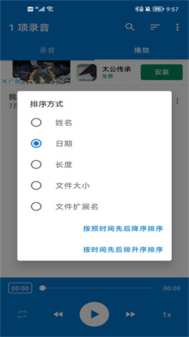 5、当录音文件数量较多时,点击界面上方的三条线图标,可对录音进行排序整理。