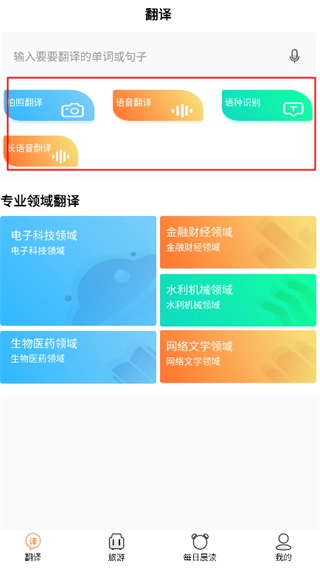 1、在本站点击安装并打开,首页上方的四个功能可解决您大部分的翻译问题,按需选择就行。