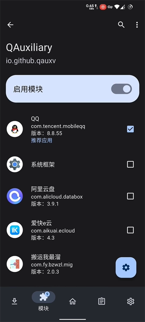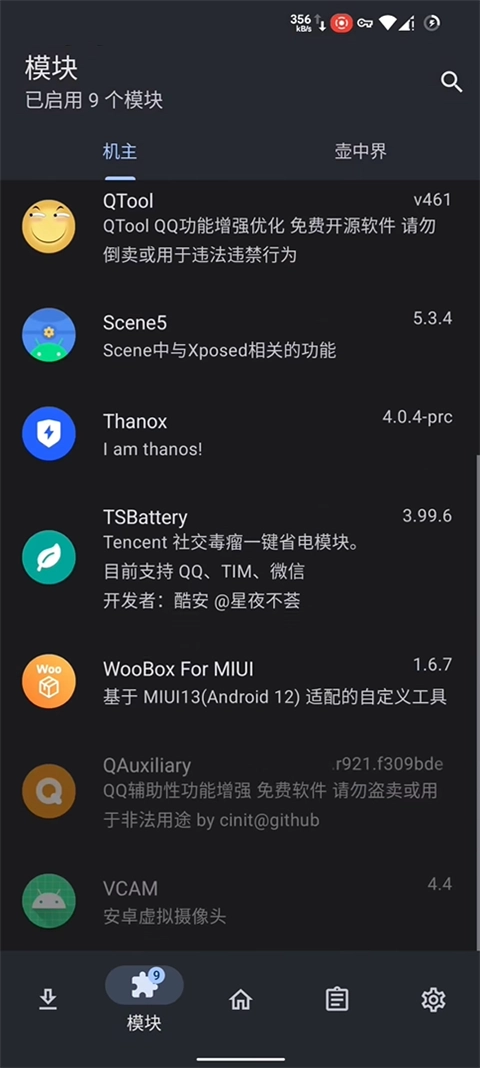 3、在模块列表里,长按任意一个模块就能选择支持,此外,框架和管理器还会提供问题解答。