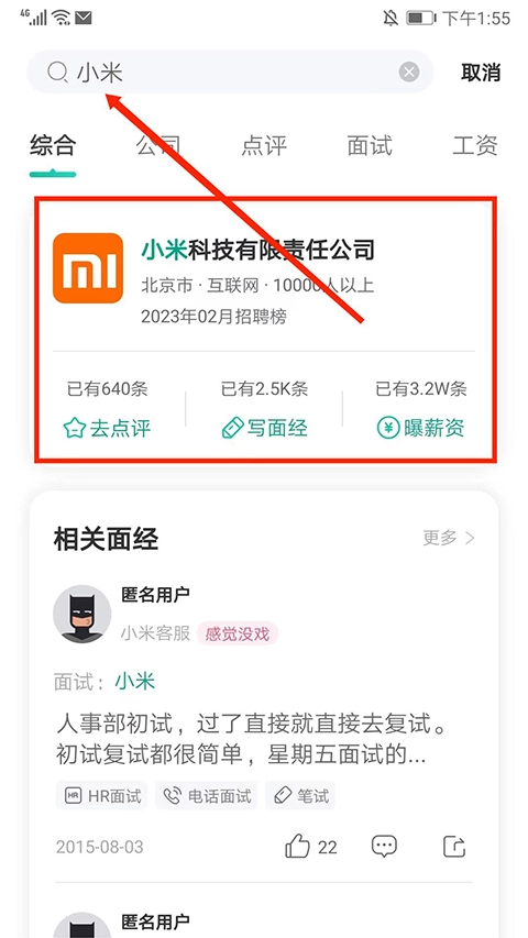 2、在搜索框输入“小米”后,选择公司。