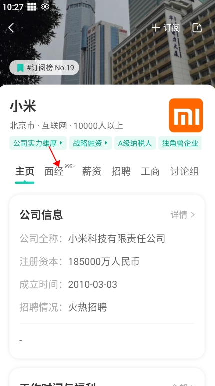 3、进入到公司信息界面,选择下方“面经”选项。