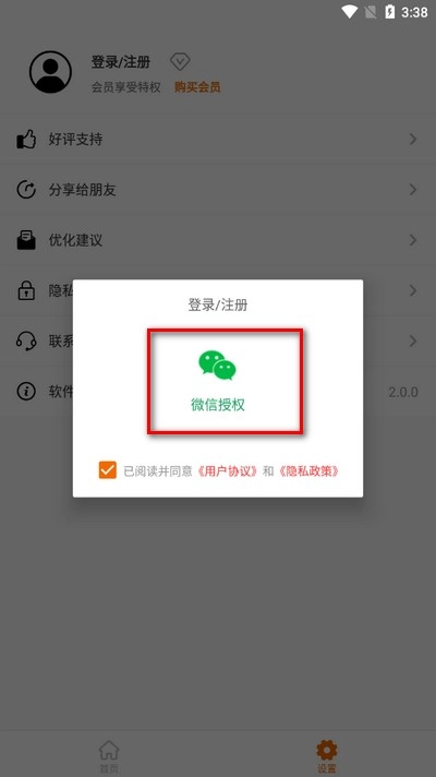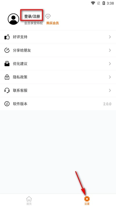 2、打开软件,点击下方设置,再点击上方登录/注册。