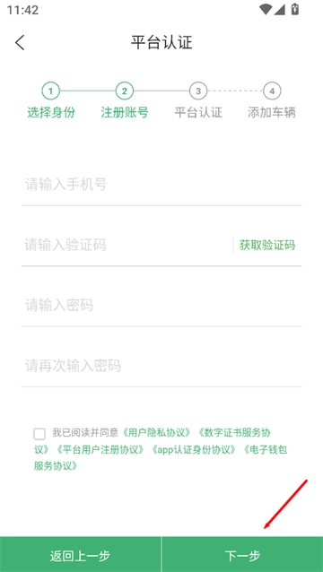 输入手机号、验证码、密码,添加车辆后完成注册。