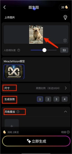 进入对应的界面后,点击上传图片,接着选择人脸相似度、风格叠加以及画面风格提示词等相关选项。