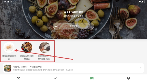 打开食卡卡应用,点击底部对应的图标,进入食卡卡+食物数据库页面,即可探索健康饮食相关内容。