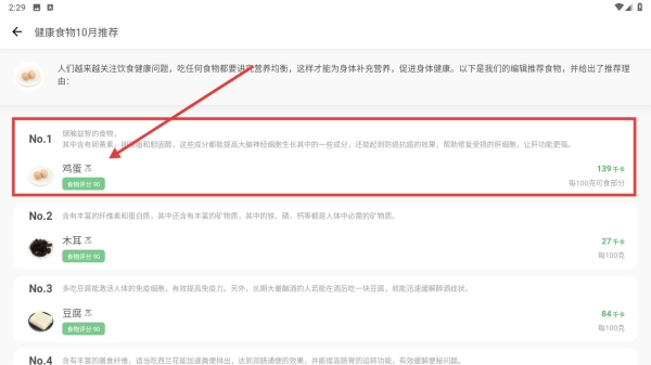 进入专题详情页面后,点击鸡蛋等推荐的食物,就能了解这些食物的营养分析和推荐理由,从而学习到健康饮食的相关知识。