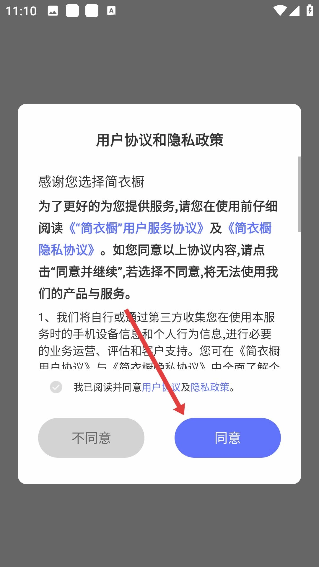 在使用简衣橱之前,你需要在用户协议与隐私政策的界面上,认真阅读相关的协议内容,之后勾选“我已阅读并同意”这一选项,再点击“同意”按钮,这样才能够继续使用该应用。