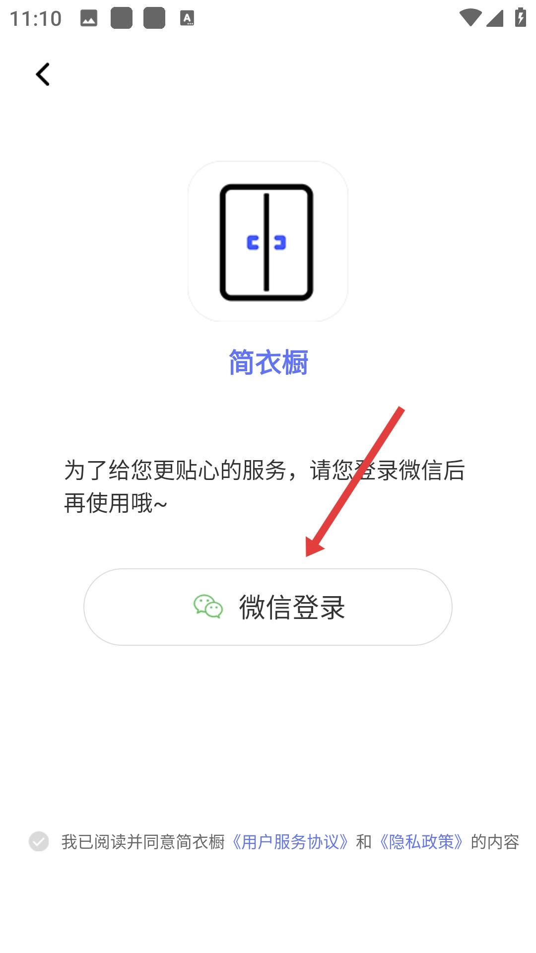 在简衣橱的登录页面,您需要先勾选同意相关协议,接着点击微信登录按钮,通过微信账号完成登录后,就能体验到更为贴心的服务了。