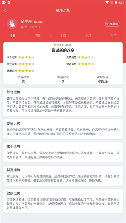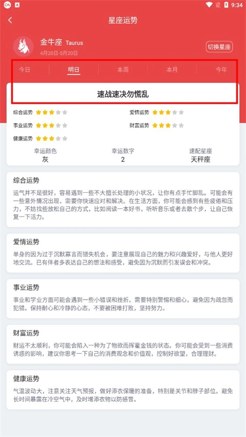 还可以查看今日、明日、本周、本月乃至今年的运势。