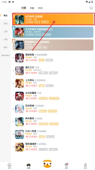 在分类页面中定位到具有仙风道骨风格的游戏选项,点击后即可跳转至该游戏的详细信息页面。