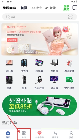 启动华硕商城APP后,在界面底部找到分类入口并点击,即可跳转至商品分类展示页面。