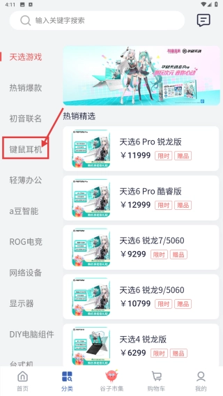 在商品分类页面,选择键盘耳机分类选项,即可进入键盘耳机商品列表页面。