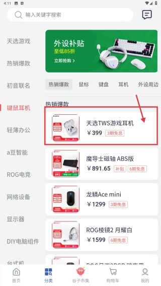 在键盘耳机的商品列表里,找到天选TWS游戏耳机并点击,就能进入它的商品详情页面啦。