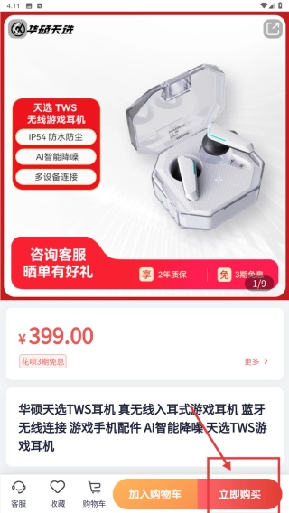 在商品详情页,点击“立即购买”按钮,即可完成天选TWS游戏耳机的购买流程。