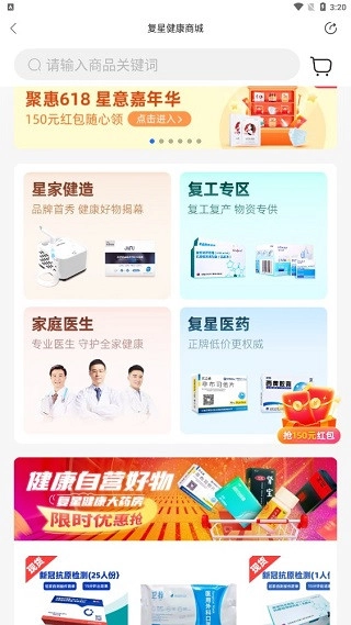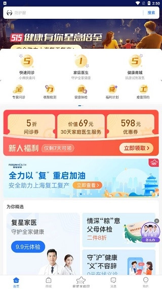 在“复星健康”App的首页,既能进行在线问诊,也能在健康商城选购全网低价药品。