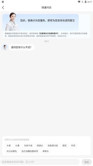 如“快速问诊”,在这里你既能描述自身症状,也能点击相关标签来进行快速回应;