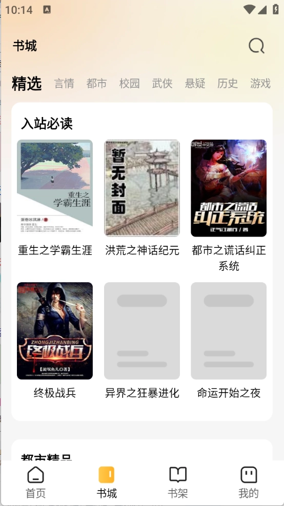 “书城”页面把小说划分得很细致,涵盖了言情、都市、校园等不同类别。