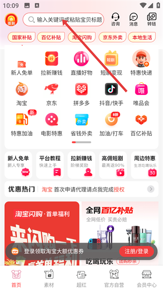 1、进入首页后,点击页面顶部显示“输入关键词或粘贴宝贝标题”提示文字的搜索框,即可启动商品搜索功能。