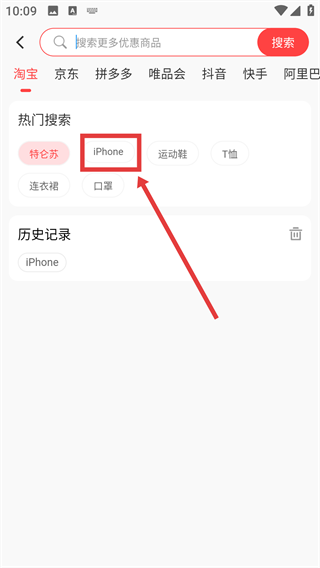 在搜索页面,您可以点击热门搜索区域里的【iPhone】选项,以此快速启动商品搜索操作。