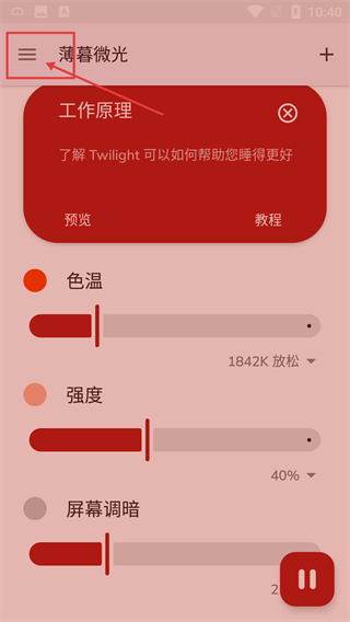 1、点击界面左上角的菜单按钮,会弹出【工作原理】窗口,从中可以了解【Twilight】助眠的功能逻辑,还能对色温、强度等参数进行调整。