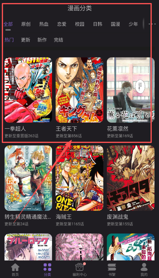 2、接下来就可以开始探索内容了,首页会展示精品漫画推荐,进入分类页面后,还能按照热血、恋爱等标签或者更新状态,筛选出你感兴趣的作品。
