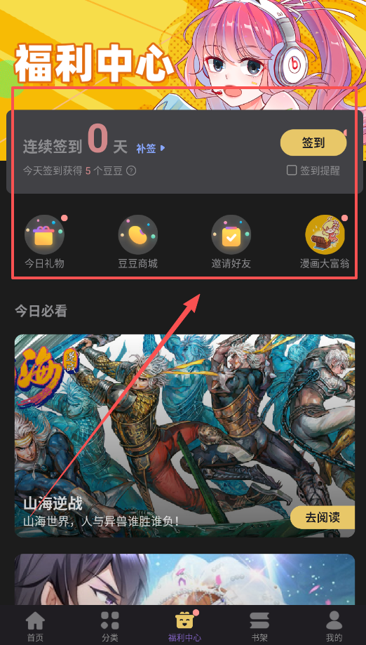 3、接着记得每日福利,进入“福利中心”完成签到就能获取豆豆,这些豆豆还能在豆豆商城里兑换各类福利。