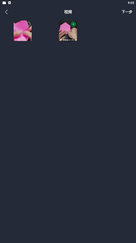 2、点击后会弹出一个新页面,在该页面里选定要处理的视频,接着点击右上角的【下一步】按钮。