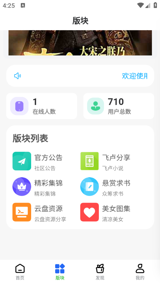 4、“板块”页面,汇聚了美图、云盘资源与小说资源的分享内容。
