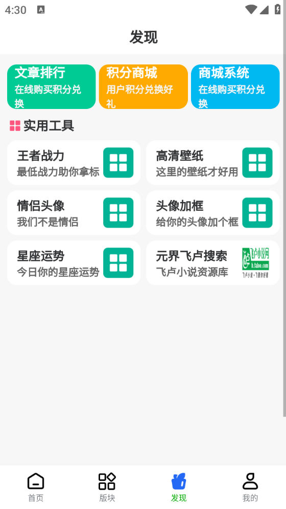 5、“发现”页面汇集了各类实用工具,像高清壁纸、网址战力、星座运势等都包含在内,用户直接点击即可使用。