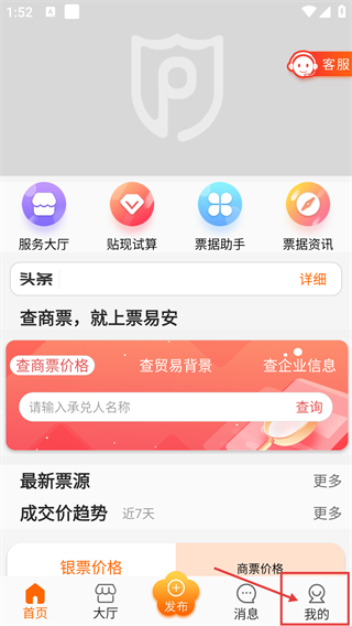 1、打开【票易安】首页后,能使用【服务大厅】【贴现试算】等功能,点击底部的【我的】按钮,即可进入账户相关的操作界面。